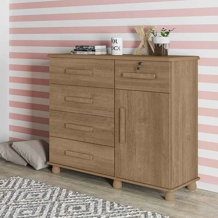 Dimensões (AxLxP)Altura: 101 cm, Largura: 118 cm, Profundidade: 45 cm, Estrutura em MDP 15 mm, Porta em MDP 15 mm, Frente e Lateral da Gaveta em MDP 15 mm, Tampo em MDF 25 mm, Pés em Madeira Pinus, Corrediças Telescópicas, Dobradiças Metálicas, Puxadores em MDF, Possui Gaveta com Chave