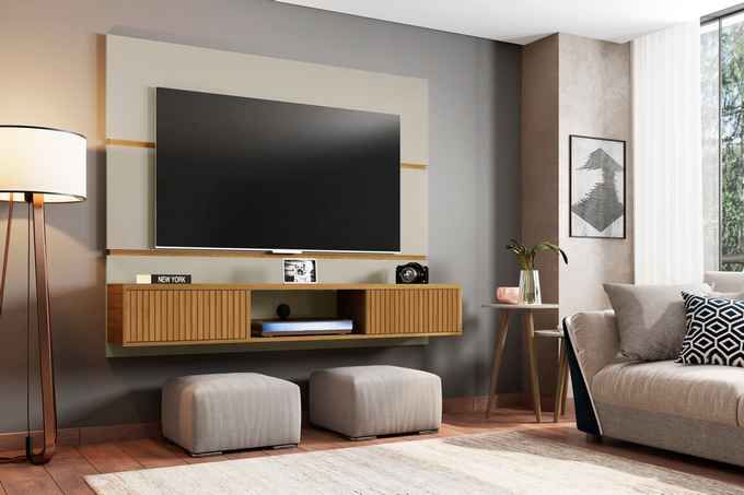 O Painel Âmbar é ideal para sua sala! Com designer moderno e muito funcional ele conta com amplo tampo e nicho central que comportam perfeitamente os mais variados tipos de objetos de decoração, bem como aparelhos eletrônicos. Possui duas portas com dobradiças metálicas e amplo espaço interno. A configuração com colunas e barras traseiras de 15mm possibilita a instalação oculta de cabos e fios, que podem ser transpassados à TV e demais equipamentos, na frente do painel. Seu tampo é elaborado em MDP de 25mm, demais componentes da estrutura em MDP de 15mm, garantindo qualidade e resistência ao produto. Com amplo espaço livre no painel ele comporta TVs de até 65 polegadas!